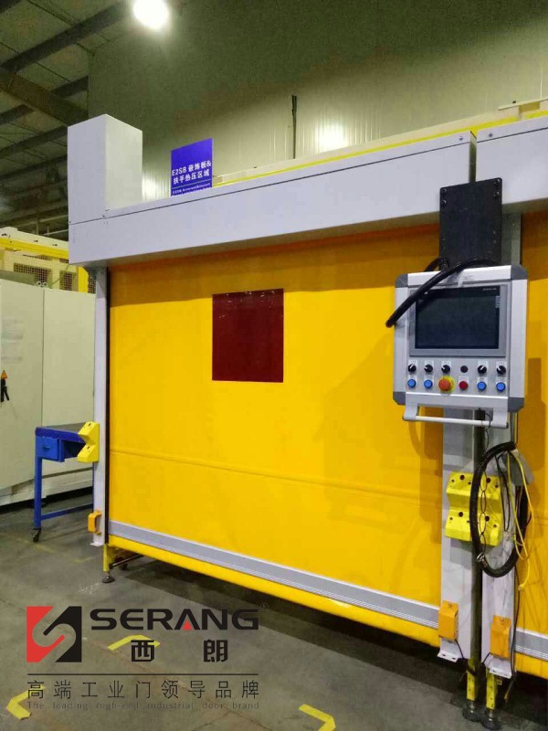 此次的项目为汽车零配件冲压线的配套产品,所以工业快速门必须和冲压设备做联动,一天的开关次数为800次,透视的视窗为客户定制的防弧光材料,保证设备在冲压的时候不会对快速门外操作人员产生伤害。