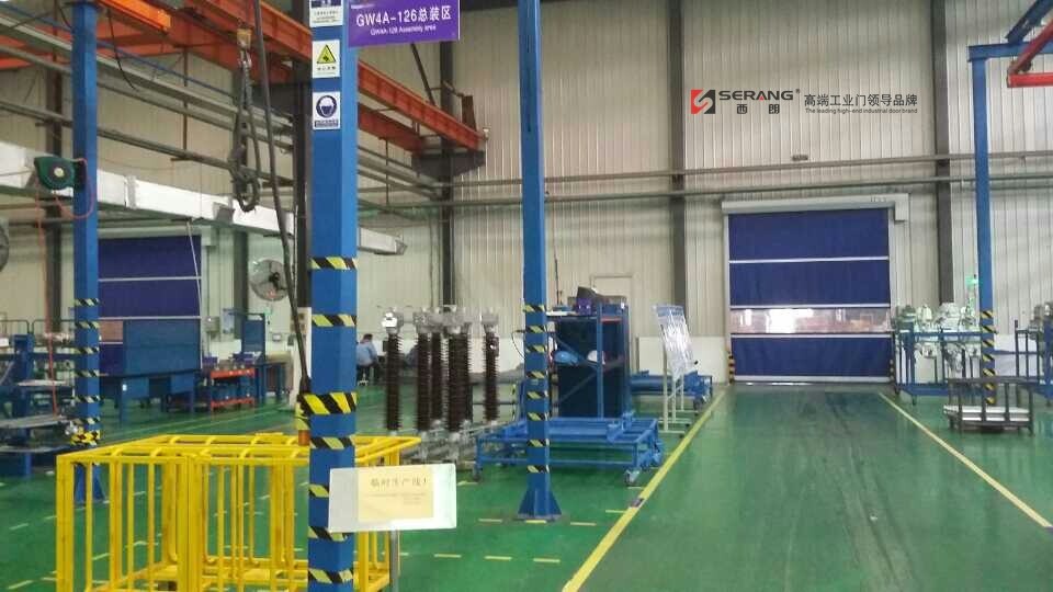 精密车间内安装PVC快速卷帘门,中间有透明视窗,可以观察对面有无人员车辆,防止发生碰撞等意外,因为室内整理为蓝色,所以在门帘选择上,也进行色调的统一化,门帘也为蓝色,更加符合精密车间内的整体氛围,达到协调的效果。