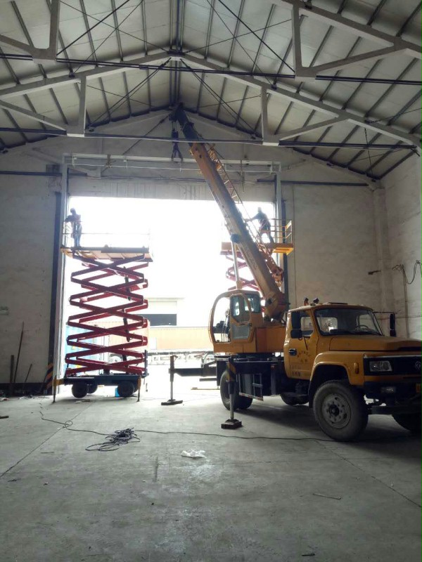 浙江某液化空气公司大型抗风堆积门紧张安装中