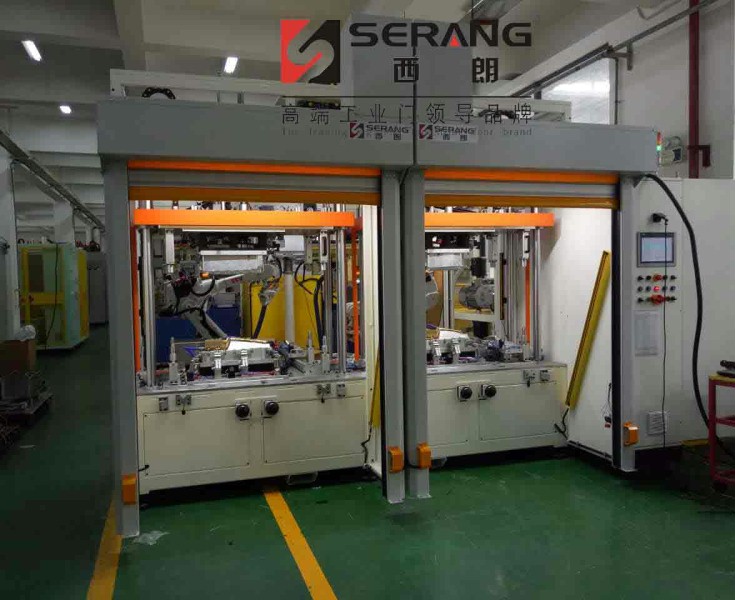 这次安装在两台机械手臂操作间,由于机械手臂在焊接的时候会向外喷出火光和碎屑之类的物质,对车间环境造成破坏,也存在对操作人员的误伤。所以在机械手臂焊接操作间的外面,安装两樘快速卷帘门,能够有效防止上述情况。