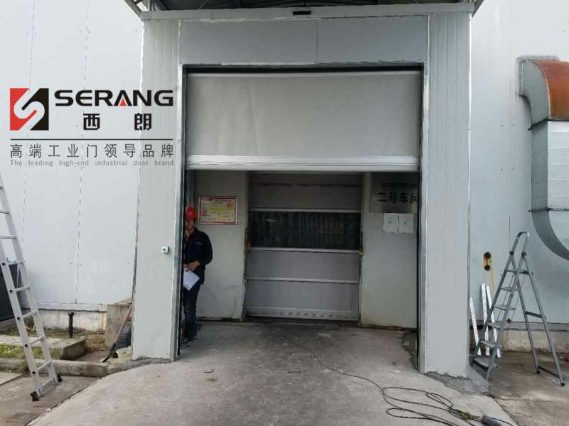PVC快速卷帘门使用灰色门帘,和厂房外观颜色一致,整体美观、协调。符合企业使用要求。