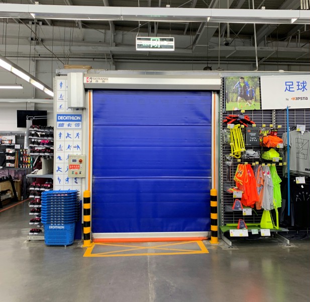 迪卡侬商城使用的西朗PVC快速卷帘门,已累计使用5年以上,现在仍然全天使用,高速频繁无故障,实拍图如下。西朗快速卷帘门具备高速的隔断功能,整体外框采用铝合金框架,橘色醒目的橡胶条,蓝色门帘耐脏,美观。