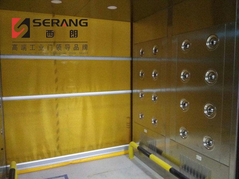 随着生产标准的提高,会有越来越多的风淋室互锁PVC快速门投入使用,这也是产业升级的需要。 下图:风淋室箱体和PVC快速门框架都为SUS304不锈钢,符合洁净车间的使用要求。