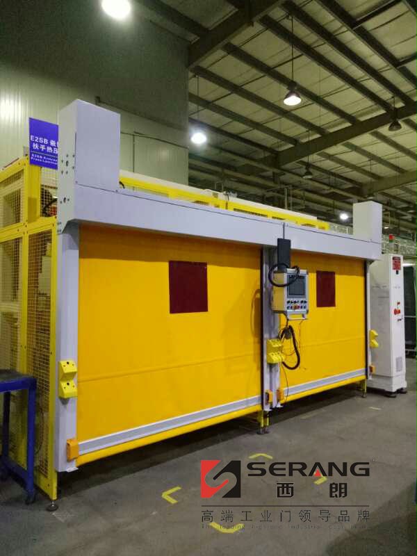 此次的项目为汽车零配件冲压线的配套产品,所以工业快速门必须和冲压设备做联动,一天的开关次数为800次,透视的视窗为客户定制的防弧光材料,保证设备在冲压的时候不会对快速门外操作人员产生伤害。