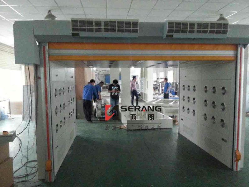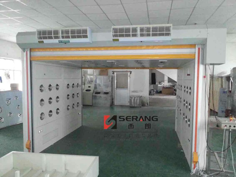 上图就是企业采购的货淋室,因为用平开门不方便叉车进出,所以由西朗门业进出方案调整,风淋室两侧改成快速门,实际使用空间大大增加。