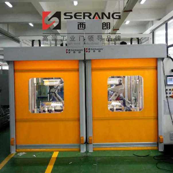 这次安装在两台机械手臂操作间,由于机械手臂在焊接的时候会向外喷出火光和碎屑之类的物质,对车间环境造成破坏,也存在对操作人员的误伤。所以在机械手臂焊接操作间的外面,安装两樘快速卷帘门,能够有效防止上述情况。