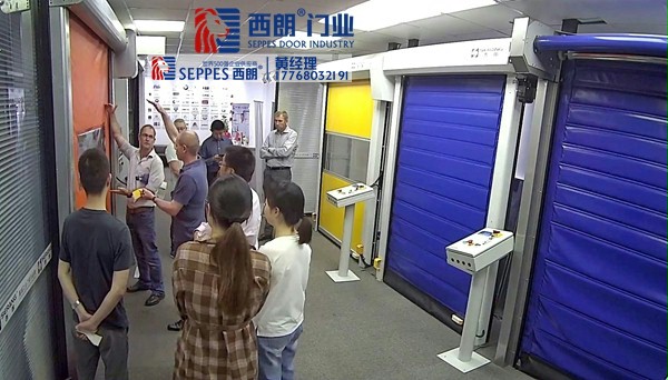 外资工厂客户首先参观了西朗门业展厅,接待人员重点介绍了快速卷帘门、冷库保温快速卷帘门、涡轮硬质快速卷帘门、防护型快速卷帘门、抗风快速堆积门、变频工业提升门、工业门封、装卸货平台等工业门及物流设备产品,并就产品的功能特点、实际使用、技术参数等一一进行交流。