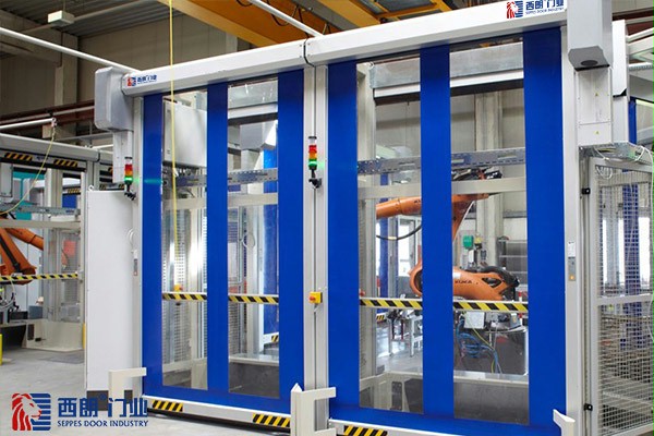 防护快速门:加厚磨砂材质门帘,可防弧光、零件、火花等,推荐使用在工厂内部生产设备间、机器人工作间、焊接设备间、车间特殊隔离区、水刀房等需要人员机械隔开防护的场景,可与机器设备进行联动工作。