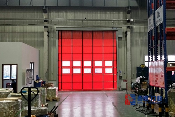 抗风堆积快速门:背带提拉式门帘,配置多条抗风钢管,具有较高的抗风性能,多数安装在大洞口的流动区域,推荐使用在仓库、物流中心、垃圾中转站等大洞口叉车通行区域。